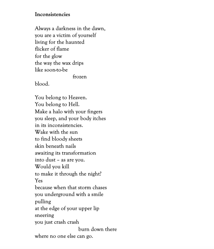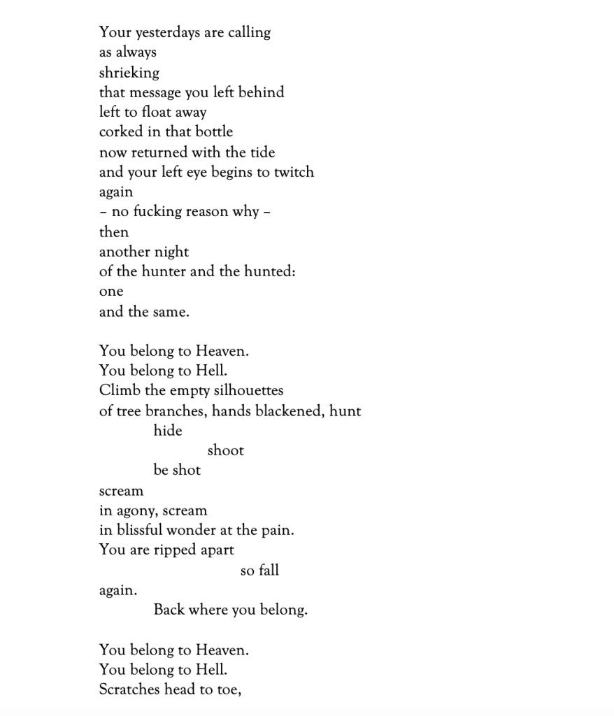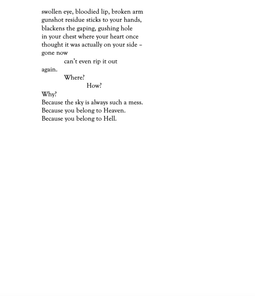 This video poetry piece is entirely original – all music/sounds, footage/images, and words are my own. The video was filmed in Washington, DC. This poem-video combo paints a picture of the confusion/fear/anger/recklessness caused by Multiple Personality Disorder. The repetition of the lines “You belong to Heaven. / You belong to Hell.” propel the piece forward in a dive toward a different sort of darkness.