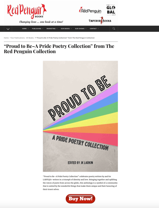 To wrap up Pride Month, three of my poems were included in a new anthology by The Red Penguin Collection titled “Proud to Be–A Pride Poetry Collection.” Now available for purchase, the anthology includes my poems “No Say,” “Bleeding Hearts,” and “Chaos in the Cosmos.”
