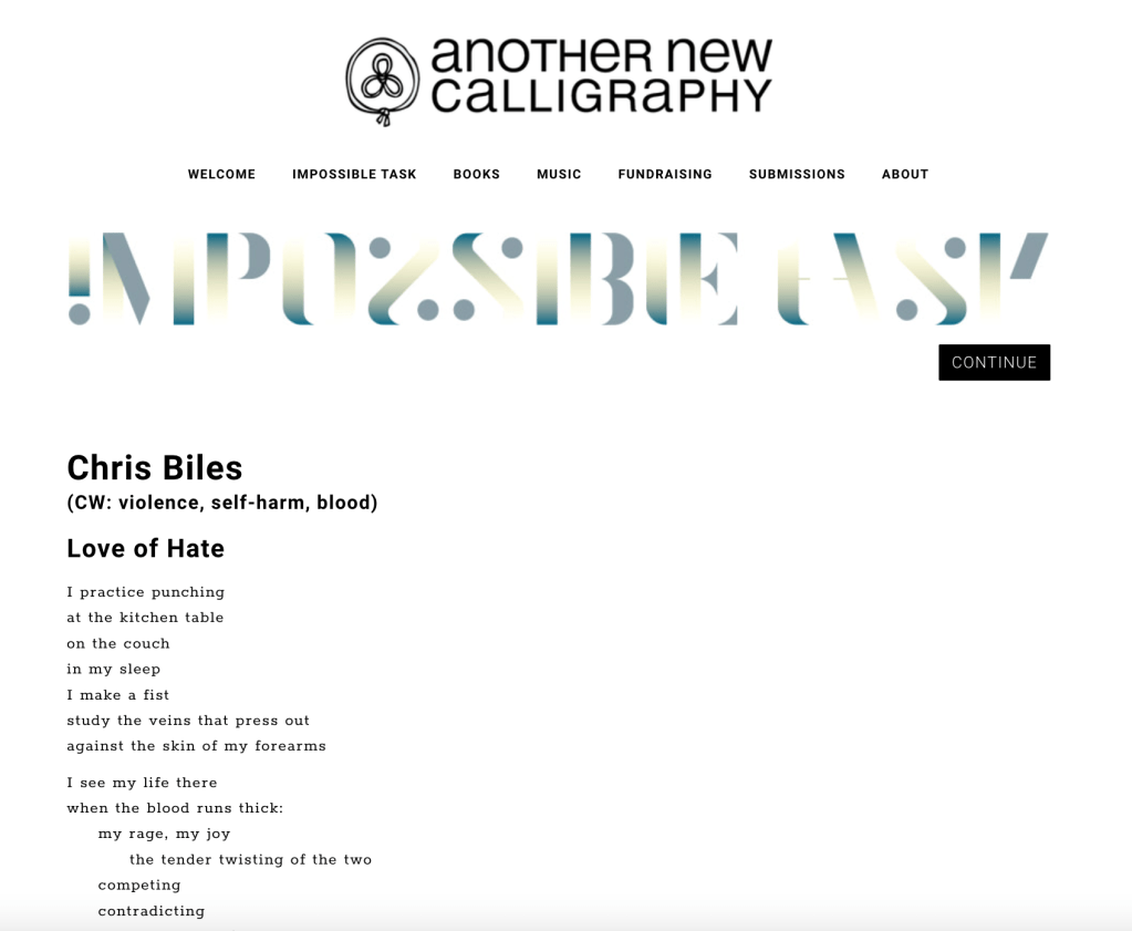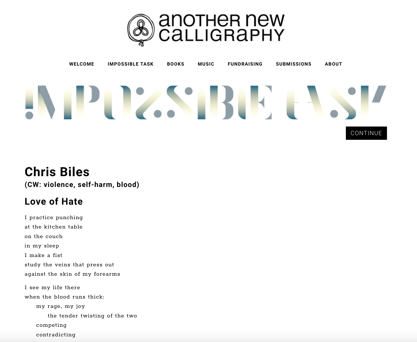 Another New Calligraphy publishes an online journal called Impossible Task. Five of my poems were featured in the April publication: “Cause and Effect,” “Love of Hate,” “just a body,” “No Say,” and “Bleeding Hearts.”
