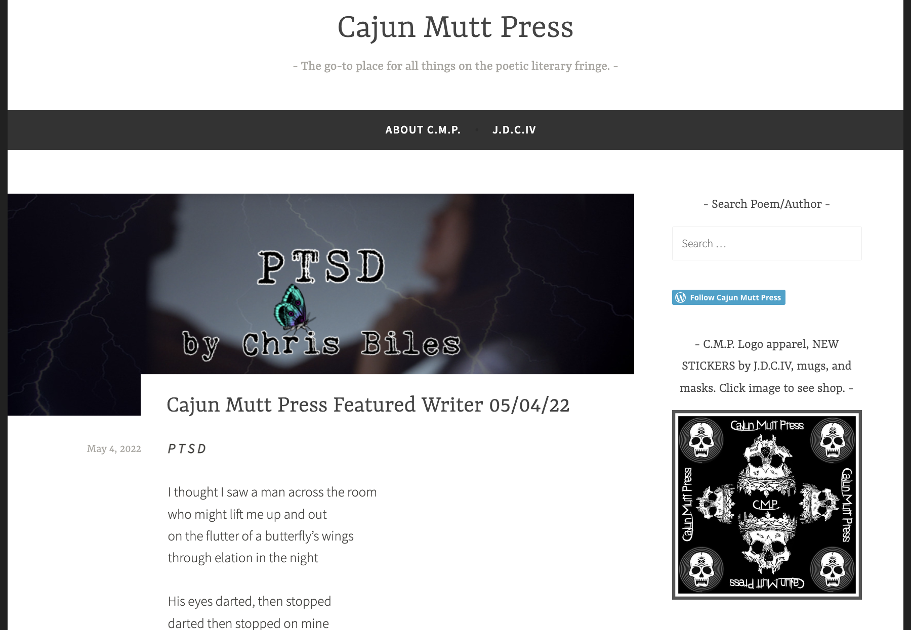 Cajun Mutt Press routinely features artists online and published one of my poems, “PTSD,” on May 4th.