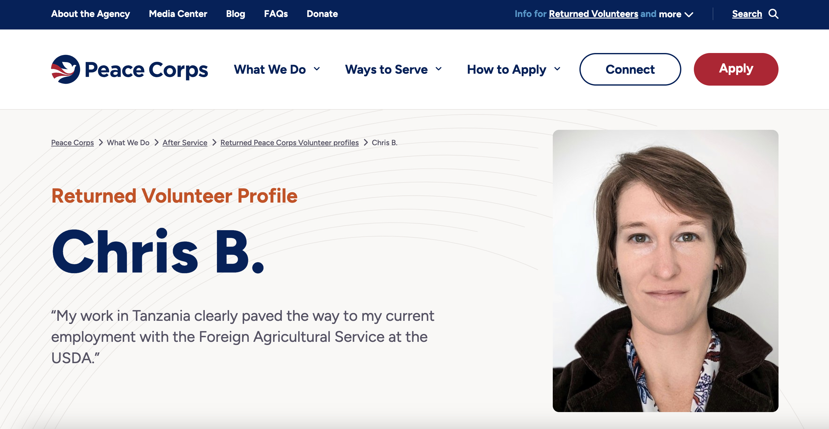 In June of this year, I was excited to be featured on the new / re-vamped Peace Corps website. On the site, they now have a wide selection of profiles in the “After Service” section to showcase the stories of now returned volunteers. I am always a big supporter of storytelling and think these profiles are great snapshots of service, but also of the possibilities that come after.