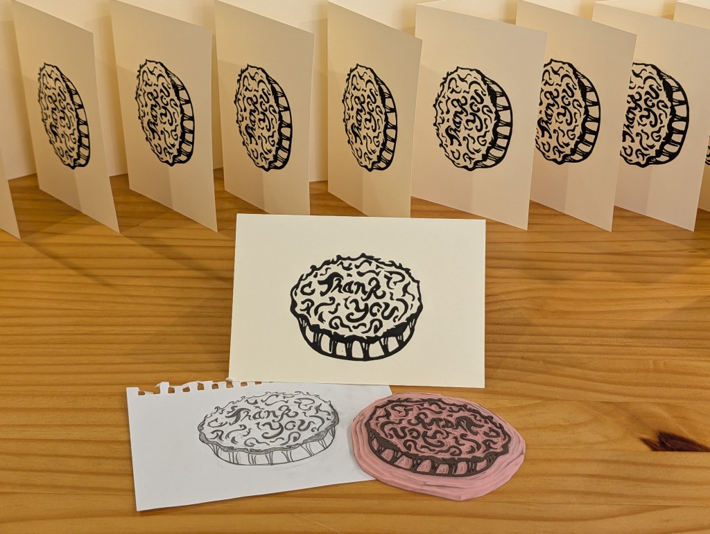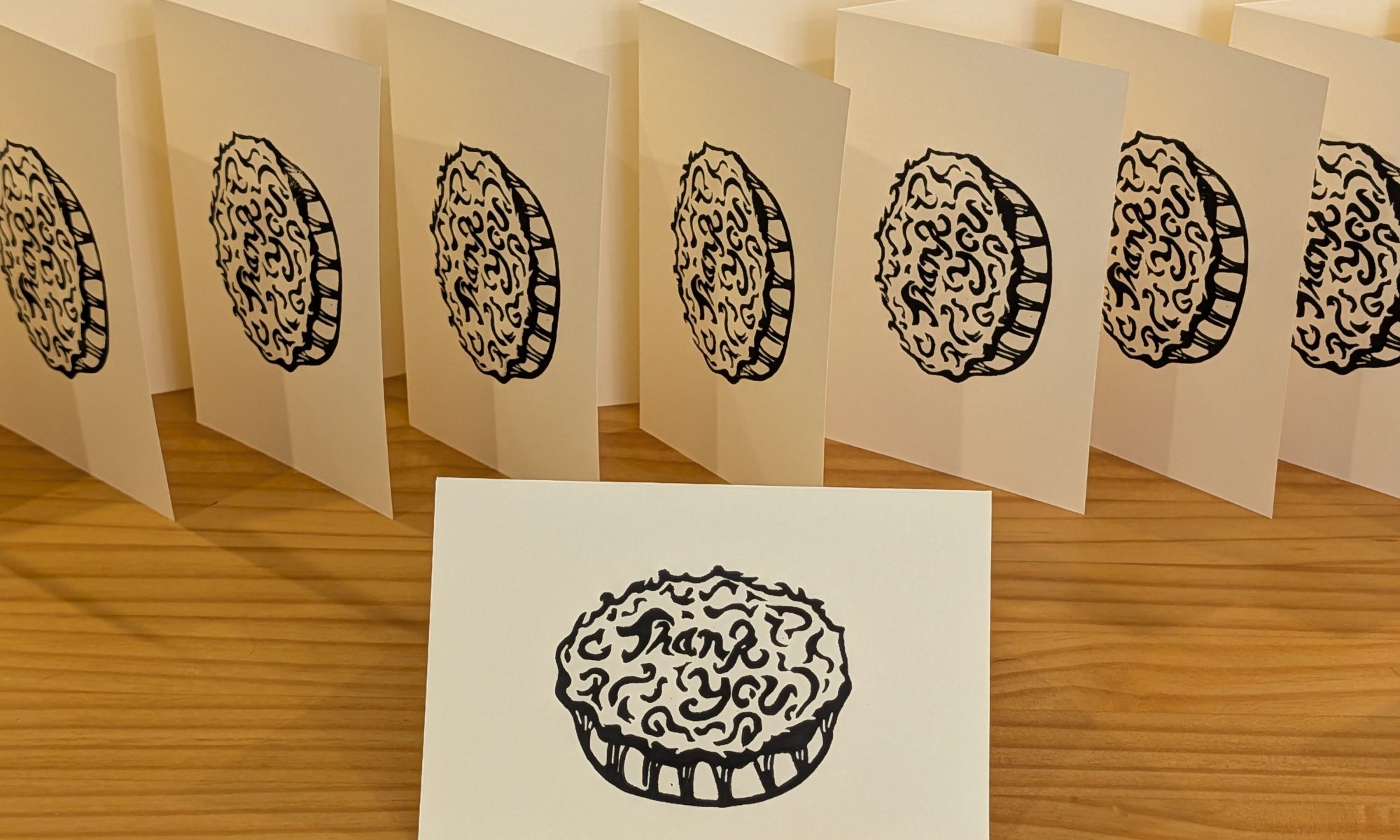 This is a photo of my first commission (shared with permission) – wedding thank you cards. The couple had a delicious spread of wedding pies rather than cake and asked to showcase their dessert choice in their thank you cards.