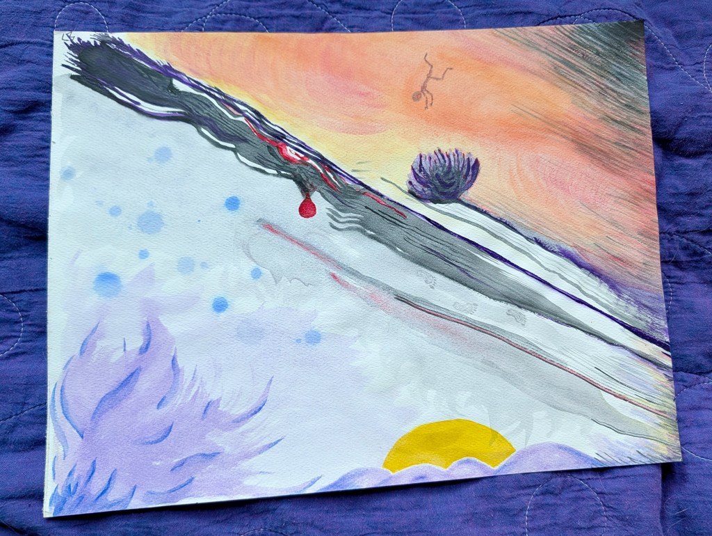 Colors of hot, ragged rage and cool, beautiful tranquility are split by the grayness in which we walk, the suggestion of a howling face and a bloody blade, and the impression of some flower either blooming or dry and dead. This piece is meant to depict the contradicting emotions that come with loss and grief. (Water color, ink, colored pencils on paper.)