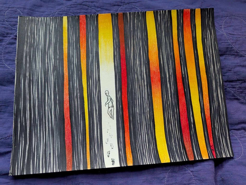 In the Forest This image depicts a figure’s quiet disappearance into their forest filled with sunset – or fire – or both. (Sharpie drawing with pastels.) Share this: Click to share on X (Opens in new window) X Click to share on Facebook (Opens in new window) Facebook Like Loading...
