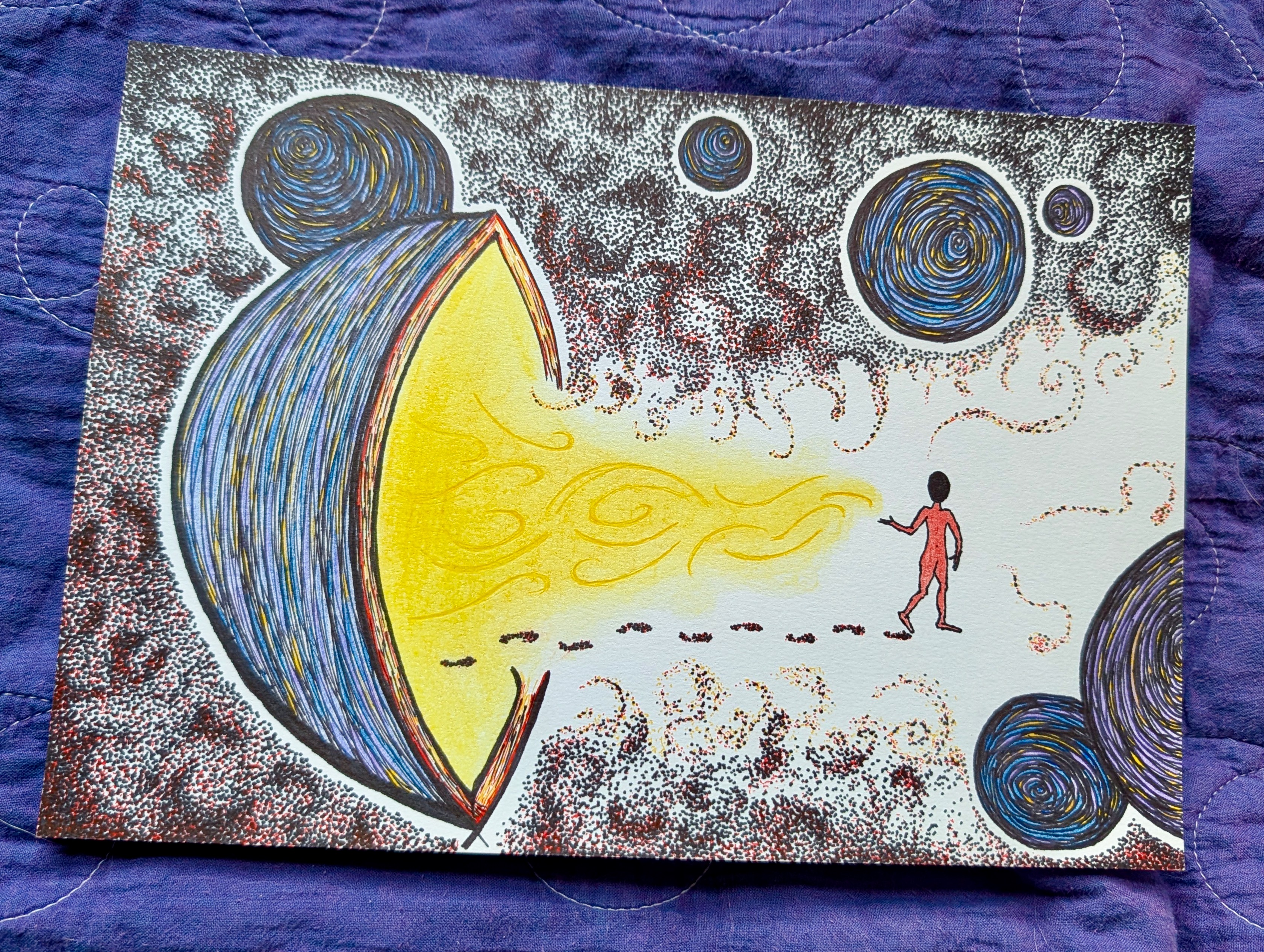 Into Darkness Set in the great unknown of outer space, between celestial bodies, this piece is meant to elicit a sense of loneliness as the figure walks from a world of light into darkness. (Sharpie drawing on paper.) Share this: Click to share on X (Opens in new window) X Click to share on Facebook (Opens in new window) Facebook Like Loading...